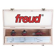 The Freud 3-piece cabinet bit set combines the popular rail and stile bits with a 3-1/2-inch diameter traditional raised panel bit. This set allows the woodworker to build doors with true mortise and tenon construction for rock-solid joints that last a lifetime. These MicroGrain carbide bits cut all composition materials, plywood, hardwood, and soft wood. They feature an anti-kickback design for safety, multi-axis grinding for burn free cuts, a Perma-shield coating to resist heat, and a shear angle design that produces a truly superior finish. This set is designed for use on 1/2-inch shank table-mounted router with 3/4-inch stock, and it includes bits 99-260 and 99-518 -- plus an attractive wooden storage box.